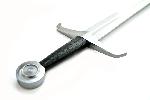Blade Material 1050 Carbon Steel forged, Guard and pommel made from steel. Wooden handle with leather. Blade thickness 3 mm, rounded tip.