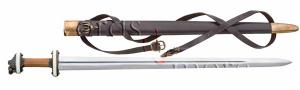 This is a fine example of the true ring-hilt sword. Its highly decorated parts have an antiqued finish including the ring (the purpose of which is still unknown). High carbon steel blade, made by Windlass Steelcrafts®. Includes highly decorated scabbard with brown leather shoulder strap with detailed parts.