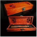 Břitva je uložena v elegantní dřevěné dárkové krabičce.