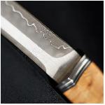 Specifikem tohoto modelu je ručně dobrušované hrotové tanto ostří. Průsečík obou ostří, známý jako Yokote, vytváří sekundární hrot s obrovskou průraznou silou. Eleganci celého setu podtrhuje rukojeť a saya (pochva) vyrobené z tvrdého dřeva sapele. Toto exotické dřevo z tropické Afriky vyniká svou červenohnědou barvou a hlubokým přírodním vzorem, který se mění podle úhlu dopadu světla.
