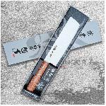 Velmi ostrý japonský nůž Nakiri/Usubagata ze série Kanetsune 555-series je vyroben z japonské nerezové oceli DSR-1K6 od společnosti Daido Steel Co., Ltd. s vysokým obsahem uhlíku. Svým tvarem nůž připomíná sekáček na maso, ale nenechte se mýlit. S čepelí snadno nakrájíte veškerou zeleninu na drobné kostičky nebo proužky. Výška nože Vám pak umožní nakrájenou surovinu jednoduše nabrat na čepel a přenést do hrnce či pánve. Vysoká čepel a klasická oválná rukojeť z Plywood Vám poskytne tu nejlepší kontrolu při řezání a krájení. Japonská preciznost a nové technologie činí tento nůž z nerezové oceli DSR-1K6 jedinečným a ideálním jak pro domácí, tak profesionální použití.