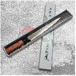 Velmi ostrý japonský plátkovací nůž Sujihiki ze série Kanetsune KC-950 Tsuchime z japonské nerezové oceli DSR-1K6 s vysokým obsahem uhlíku od společnosti Daido Steel Co., Ltd. Zajistěte, aby každá krůta, každá pečeně a každá šunka byla dokonale krájená, s bezproblémovým pohybem a bezproblémovou manévrovatelností. Pokud patříte k milovníkům hovězího carpaccia, měl by se tento nůž stát povinnou výbavou vaší kuchyně. Důlkovaný povrch Tsuchime zajistí, aby se krájené suroviny nelepily na ostří nože. Nůž je určen pro držení v pravé i levé ruce.