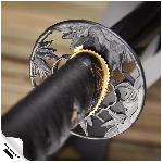 Kovaná replika katana Gohan představuje spojení tradiční japonské estetiky a moderního řemeslného zpracování. Čepel z uhlíkové oceli AISI 1045 s konstrukcí Full Tang zajišťuje odolnost potřebnou pro nácvik základních pohybů a sestav bojových umění (kata). Výjimečnost tohoto modelu spočívá v jeho dekorativním provedení – černá lesklá pochva saya nese ručně vyrytý motiv bambusu, který v japonské kultuře symbolizuje sílu a pružnost. Černá mosazná tsuba (záštita) tento přírodní motiv vkusně doplňuje.