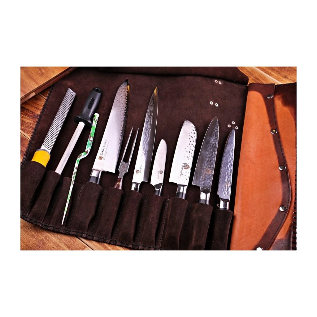 Taška je vyrobena z exkluzivní 2 mm silné hovězí kůže. Nabízí možnost uskladnění až 10-ti různých nástrojů (především nožů) o maximální délce ostří 270 mm, s celkovou délkou nože cca 400 mm. Boční kapsa o rozměru 50x12 cm je vhodná pro menší nástroje (pinzety, odměrky, škrabky, teploměry) atd. Tato kožená taška je velmi pohodlná na nošení a ušetří mnoho místa. Kůže je voděodolná, snadno se čistí a chrání nože před poškrábáním. Povrch kůže je upraven v atraktivním a rustikálním stylu VINTAGE. S přibývajícím čase je vzhled tašky Dellinger Vintage lepší a lepší. Nože a nástroje nejsou součástí dodávky.