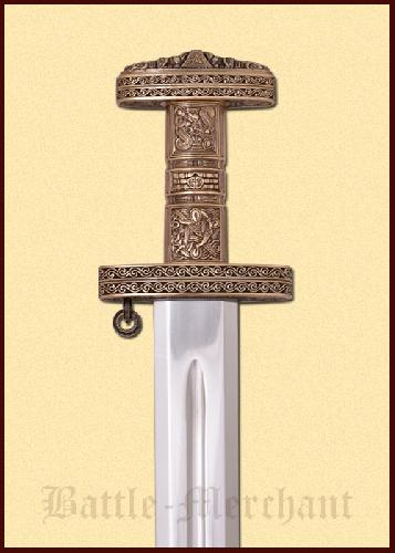 The bronze plated cast metal hilt is finely worked with geometrical and abstract Viking ornaments. The guard is typically short and ellyptic. The grip is straight and the pommel is matching the guard perfectly.