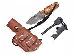 Dřevěná střenka zajišťuje příjemný úchop a přirozený vzhled, zatímco kožené pouzdro chrání nůž při přenášení a umožňuje pohodlné nošení na opasku. Součástí balení je také jiskřítko pro rozdělání ohně a praktický multifunkční nástroj, který obsahuje otvírák na konzervy, klíč na matice (8 mm), mnohohran a měřítka 1:50 000 a 1:100 000 – ideální pro práci s mapami v terénu.