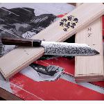 Robustní, velmi ostrý japonský nůž KIRITSUKE/Santoku 180 mm z rychlořezné práškové oceli SPG2 s působivým designem a nejvyšší kvalitou. Tento nůž je bezohledný kuchyňský válečník, který je připraven na všechna vaše přání. Japonské slovo "santoku" se zhruba označuje jako "tři ctnosti", což svědčí o všestrannosti tohoto nože. Čepel je obvykle kratší než kuchařský nůž s výrazně odlišnou geometrií. Nůž Santoku je často prohlašován za fúzi mezi šéfkuchařským nožem a nakiri, což vám přináší výhody obou zmíněných. Vyšší faseta snižuje tření, krájení je tak přesnější. SANTOKU je dokonalým společníkem při práci s masem, rybami, zeleninou a ovocem. Jelikož je špička čepele modelována podle japonského meče, je vhodná i pro přípravu pokrmů, které vyžadují použití špičky a také pro dekorativní vyřezávání. Japonské umění, preciznost a nové technologie činí tento nůž z práškové damaškové oceli (damascus steel) jedinečným a nenapodobitelným.