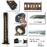 o Wakizashi and Tanto blade:Hand-forged curved blade with Bohi (groove) and Chu-Kissaki tip. Spring steel (C55Si7- USA: Steel 1055). The hardness of the Mune and of the Ha (blade edge) is 55° HRC Rockwell. The blade spine is iori-mune, the edge is without Niku. (The blade has got a flat and cutting sharp edge).
