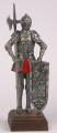 soška rytíře v brnění provedená z šedého kovu a bronzu, na dřevěném podstavci, s mečem a štítem
