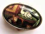 klasická kulatá lékovka je vyrobena z kovu zlaté barvy s porcelánovým víčkem s květinovým motivem