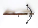 malá nefunkční replika historické kuše s dolním spouštěcím mechanizmem a puškovou rukojetí vyrobená ze dřeva a šedého kovu s dřevěnou šipkou a mosazným zdobením